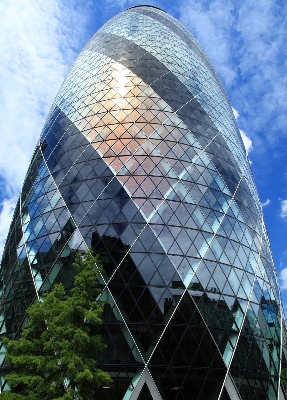 30 St Mary Axe has been hailed as a great success of modern architecture, winning numerous awards, including a unanimous vote for the 2004 RIBA Stirling prize. Its design uses double-glazing and shafts to create an energy efficient insulation effect. While most of the building is used as office space, the unique top dome level is a bar, offering excellent views of London that reach as far as Great Windsor Park on a clear day.